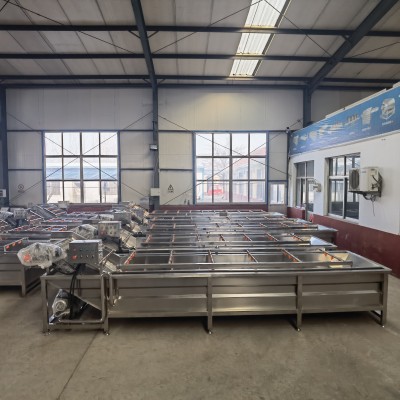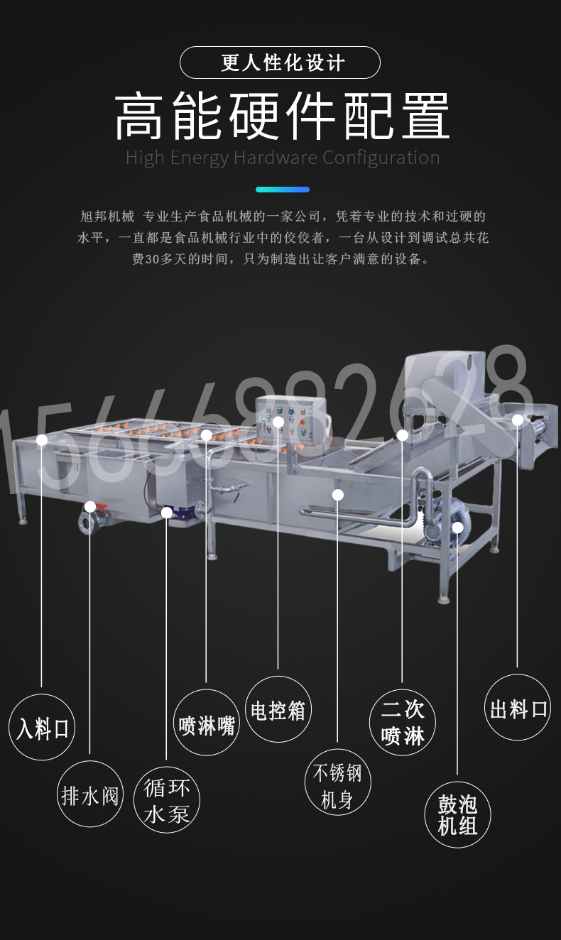 设备采用不锈钢材料安全可靠,输送平稳,速冻可调,果蔬随输送带的进行运动,能够避免对果蔬的损坏,噪音小,适合工作环境要求比较安静的场所。结构简单,便于维护,能耗较小。使用成本低。本机采用SUS 304材质制作,以水为介质,通过强流涡轮风机形成气泡翻浪,对果蔬进行柔性清洗。在清洗的同时网带上部增加喷淋管道喷头,通过高压水泵进行循环喷淋,有效的压制上浮以及物料清洗,喷头为可拆卸喷头,便于清洗防止堵塞,喷嘴角度可调,更加有效的清洗果蔬。