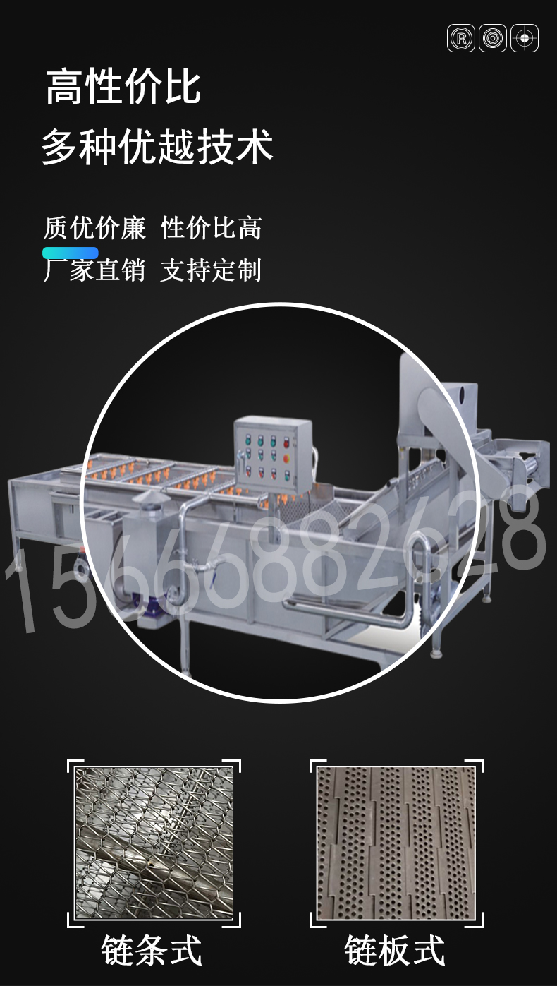 2.设备输送带电机可实现调节变速功能,被清洗的蔬菜经过网链输送,自动送料,自动出料,根据生产需要调节输送带输送速度;