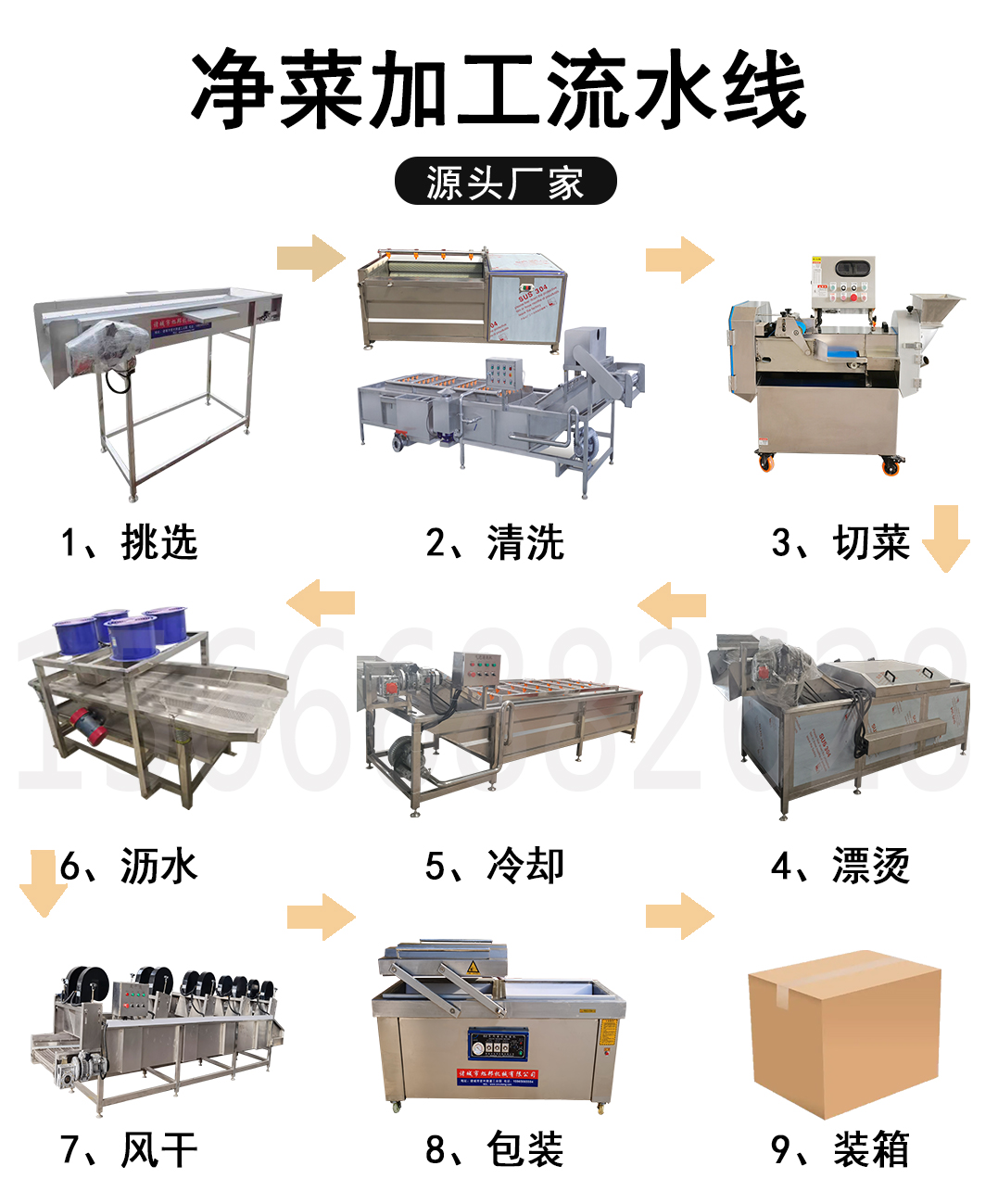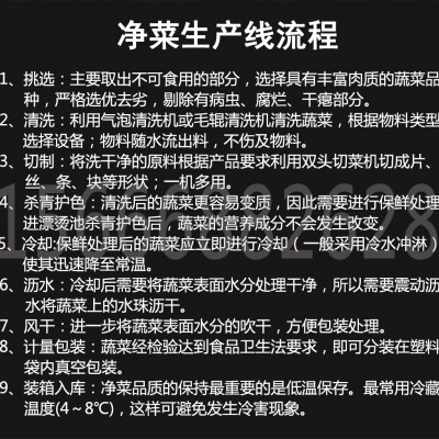 净菜加工生产线采用sus304食品级不锈钢板材加工制造而成,可以对多种瓜果蔬菜进行加工作业,随着人们生活水平的不断提高, 对于食品安全的要求也逐渐提高,例如果蔬加工是否留有农药残留,果蔬是否新鲜等等,净菜加工成套设备生产线包含有:挑选机、清洗机、沥水机、风干机、分切机、包装机等等